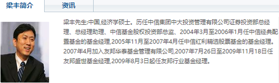 2004年,梁丰成为基金经理,成功执掌百亿资金的基金——中信基金。从投资业绩上来看,梁丰的实力不容小觑。例如他管理的中信红利精选(现为华夏收入),2005年11月17日到2007年4月12日期间,净值暴涨247%,超越业绩比较基准56%,在同类70多只基金中位列第四。