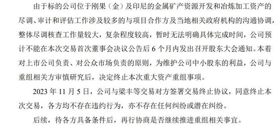 对于,终止筹划本次重大资产重组的原因,日播时尚表示,由于标的公司锦源晟位于刚果(金)及印尼的金属矿产资源开发和冶炼加工资产的尽调、审计和评估工作涉及较多的与项目合作方及当地相关政府机构的沟通协调,整体尽调核查工作量较大,复杂程度较高,暂时无法明确具体完成时间,预计不能在本次交易首次董事会决议公告后 6 个月内发出召开股东大会通知。